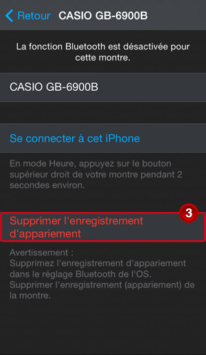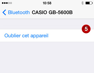 en regard de « CASIO GB-****** », puis touchez l'option « Oublier cet appareil » qui apparaît.CASIO GB-****** disparaît de l'écran, ce qui indique que les informations de couplage sur le téléphone ont été supprimées.
