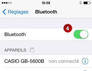 4Touchez le bouton Accueil pour revenir à l'écran d'accueil, puis touchez les options suivantes dans l'ordre pour activer le Bluetooth : « Réglages » - « Bluetooth ».
