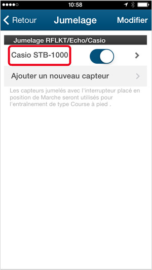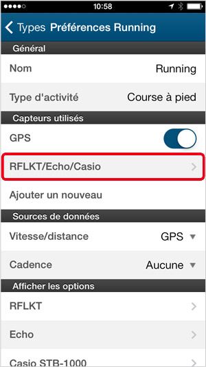 Sous [Capteurs utilisés] sur l'écran des préférences d'entraînement, touchez [RFLKT/Echo/Casio].