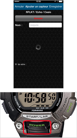 Lorsque l'application affiche l'écran illustré ci-dessus, maintenez enfoncé le bouton avant de la montre pendant deux secondes environ.