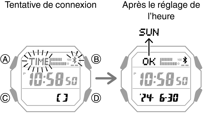 L’icône [TIME] clignote pour indiquer le lancement de la procédure de connexion. Une fois la montre connectée au téléphone, l’icône [OK] s’affiche et la montre corrige l’heure en fonction des informations fournies par le téléphone.
