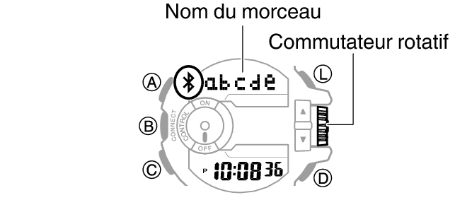 - Si la recherche du nom du morceau aboutit, celui-ci s’affiche sur l’écran de la montre.