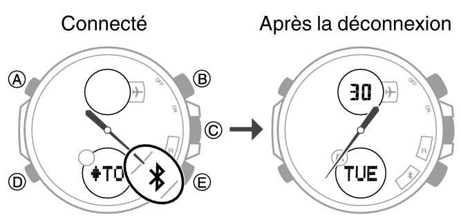 Si la montre est connectée à un téléphone, appuyez sur le bouton (C) pour mettre fin à la connexion. -