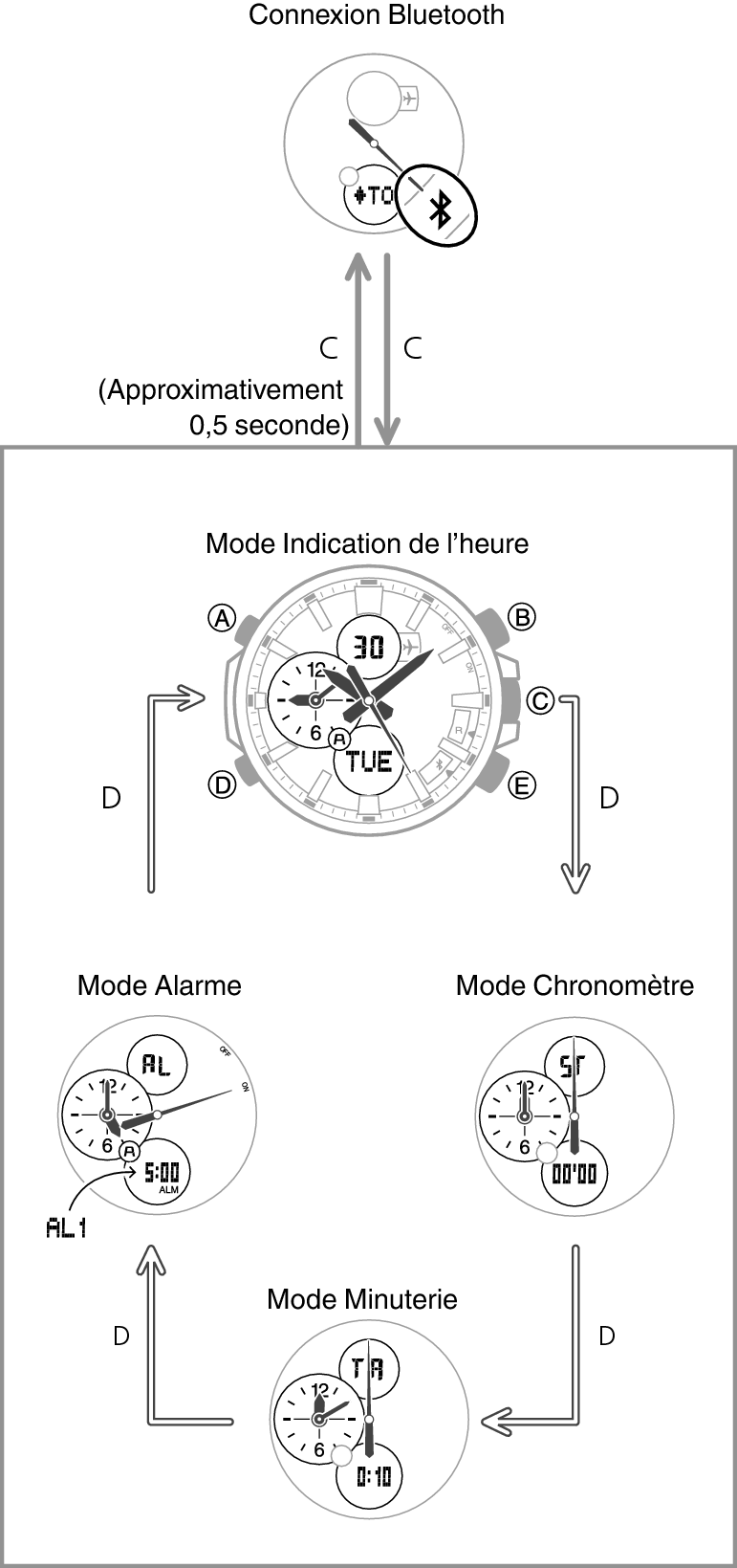 Utilisez le bouton (D) pour naviguer entre les modes. Maintenez le bouton (D) enfoncé pendant environ deux secondes pour passer en mode Indication de l’heure. Pour vous connecter à un téléphone, maintenez le bouton (C) enfoncé pendant environ 0,5 seconde.