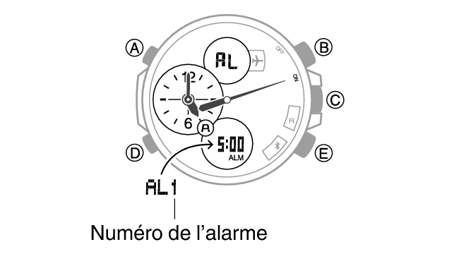 1.Appuyez sur (E) pour faire défiler les numéros des alarmes jusqu’à afficher le numéro de l’alarme que vous souhaitez configurer.