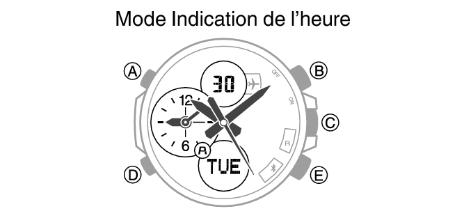 Cette procédure s’effectue en mode Indication de l’heure. Utilisez le bouton (D) pour accéder au mode Indication de l’heure.