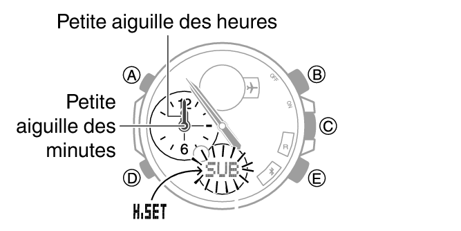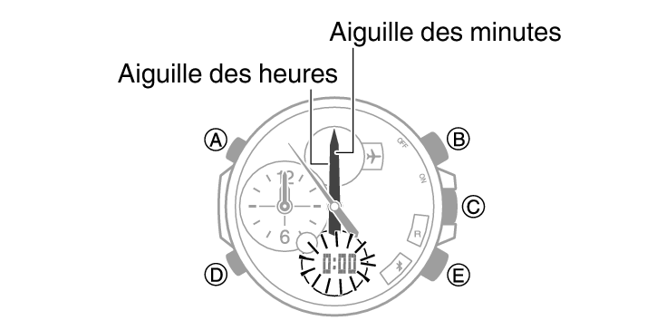 4.Si les aiguilles des heures et des minutes ne se trouvent pas sur 12 heures, utilisez (B) et (E) pour les placer dans cette position.
