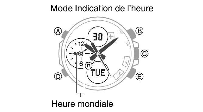 Cette procédure s’effectue en mode Indication de l’heure. Utilisez le bouton (D) pour accéder au mode Indication de l’heure.