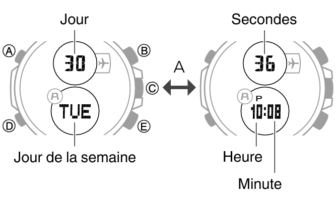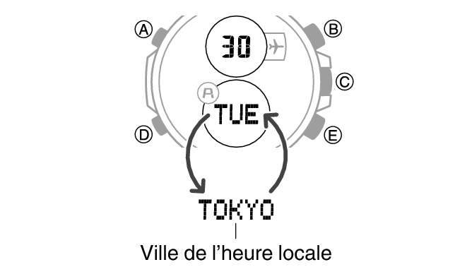 En mode Indication de l’heure, vous pouvez effectuer l’opération suivante pour modifier le contenu des affichages numériques.