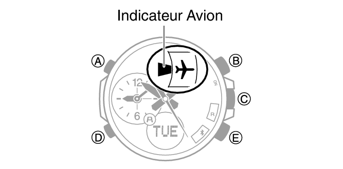 - Chaque fois que vous maintenez le bouton (D) enfoncé pendant environ cinq secondes, le mode Avion de la montre est activé ou désactivé.