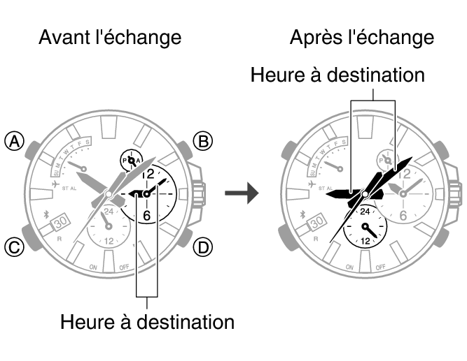 Utilisez la procédure ci-dessous pour régler facilement le jour et l’heure de la montre en fonction de votre destination.