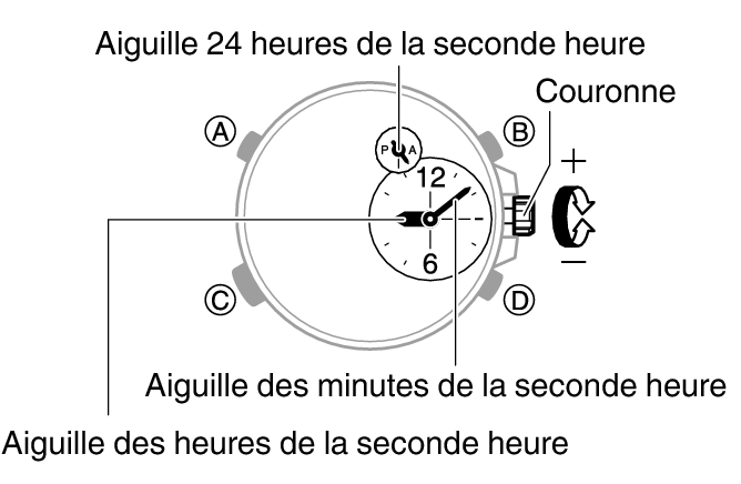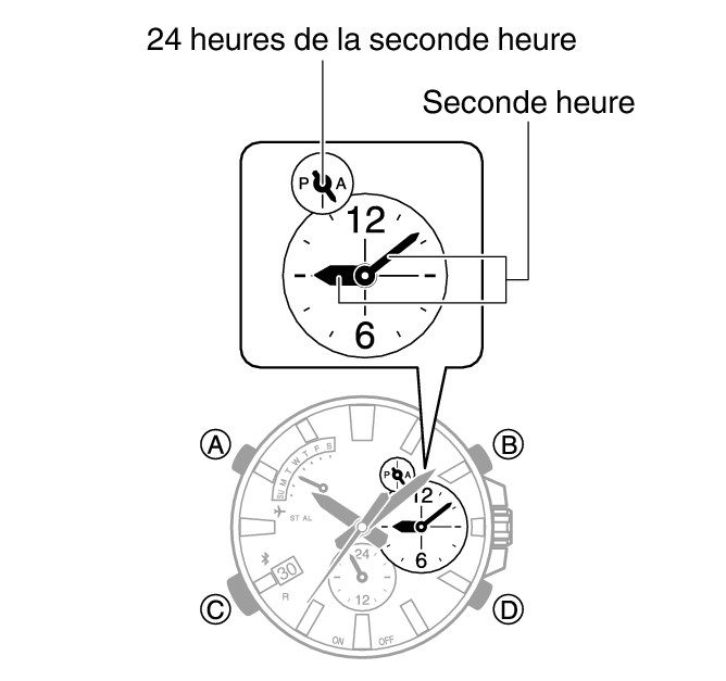 La seconde heure vous permet de consulter l’heure actuelle dans un autre fuseau horaire ainsi que l’heure à votre emplacement actuel.