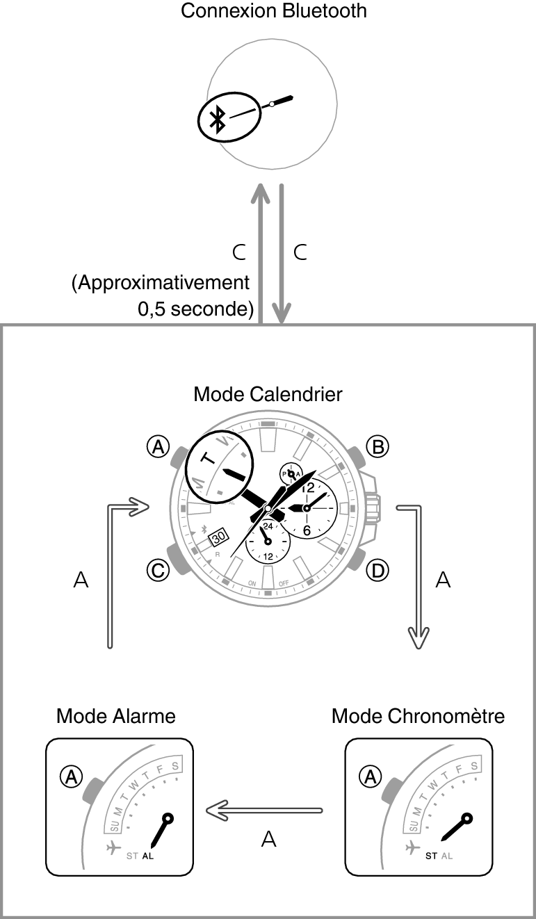 Utilisez le bouton (A) pour naviguer entre les modes. Maintenez le bouton (A) enfoncé pendant environ deux secondes pour passer en mode Calendrier. Pour vous connecter à un téléphone, maintenez le bouton (C) enfoncé pendant environ 0,5 seconde.