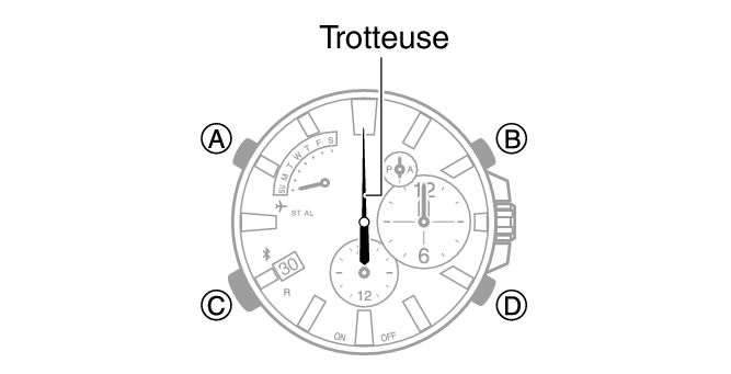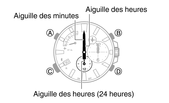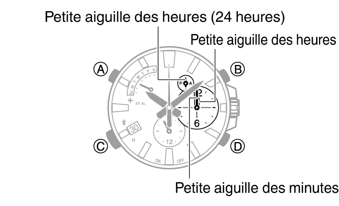 Cette opération permet de régler l’alignement de la petite aiguille des heures, de la petite aiguille des minutes et de la petite aiguille du mode 24 heures.