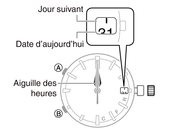- Par ailleurs, la date et de l’aiguille des heures se déplacent en même temps.