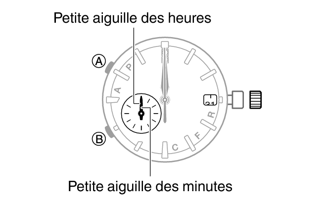 - Si votre montre n’est pas équipée d’une petite aiguille du mode 24 heures, vous pouvez régler les petites aiguilles des heures et des minutes.