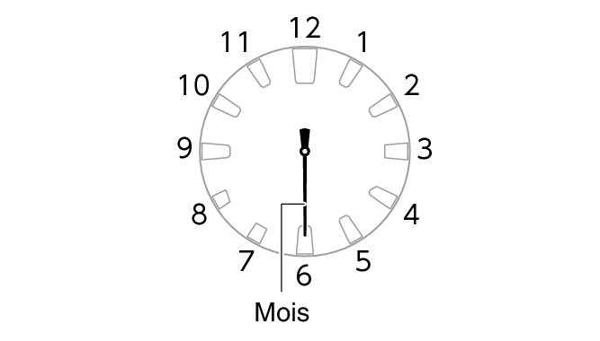 - Le fuseau horaire est indiqué sous forme de décalage horaire. La mention ±0 heures est indiquée lorsque la trotteuse est sur 12 heures, et les autres décalages sont indiqués lorsqu’elle est située à droite ou à gauche de 12 heures. Pour plus d’informations sur les positions de fuseau horaire, consultez la section ci-dessous.