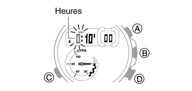 Maintenez le bouton (B) enfoncé pendant au moins deux secondes. Relâchez le bouton lorsque l’heure se met à clignoter.