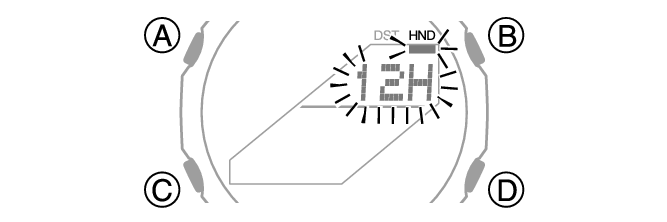 Appuyez sur le bouton (B) ou (D) pour sélectionner [12H] (indication de l’heure au 12 heures) ou [24H] (indication de l’heure au 24 heures).