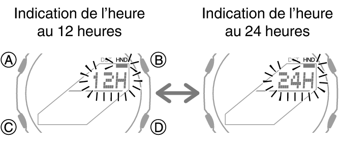 Basculement entre le mode Indication de l’heure 12 heures et 24 heures