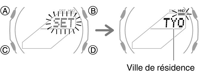 Maintenez le bouton (A) enfoncé pendant au moins deux secondes. Relâchez le bouton lorsque le nom de la ville de résidence actuellement sélectionnée s’affiche sur l’écran.