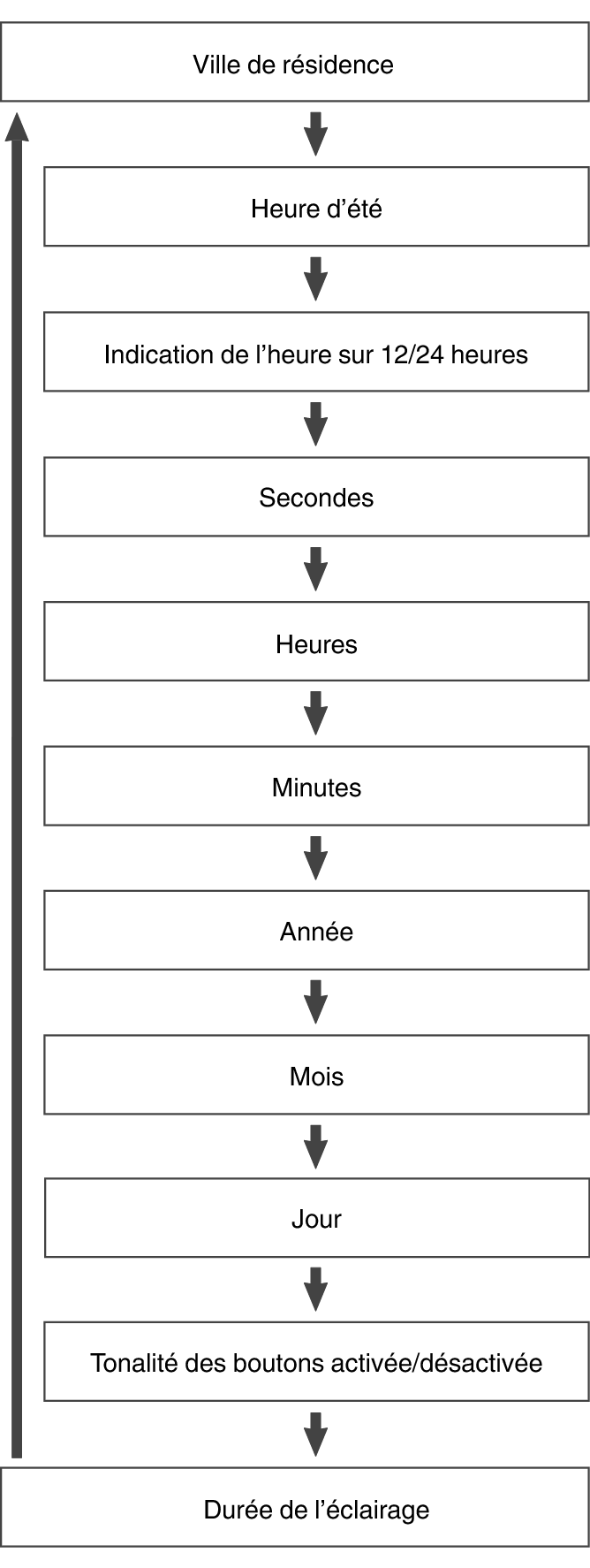 Chaque pression sur (C) déplace le clignotement jusqu’au prochain réglage dans la séquence affichée ci-dessous.
