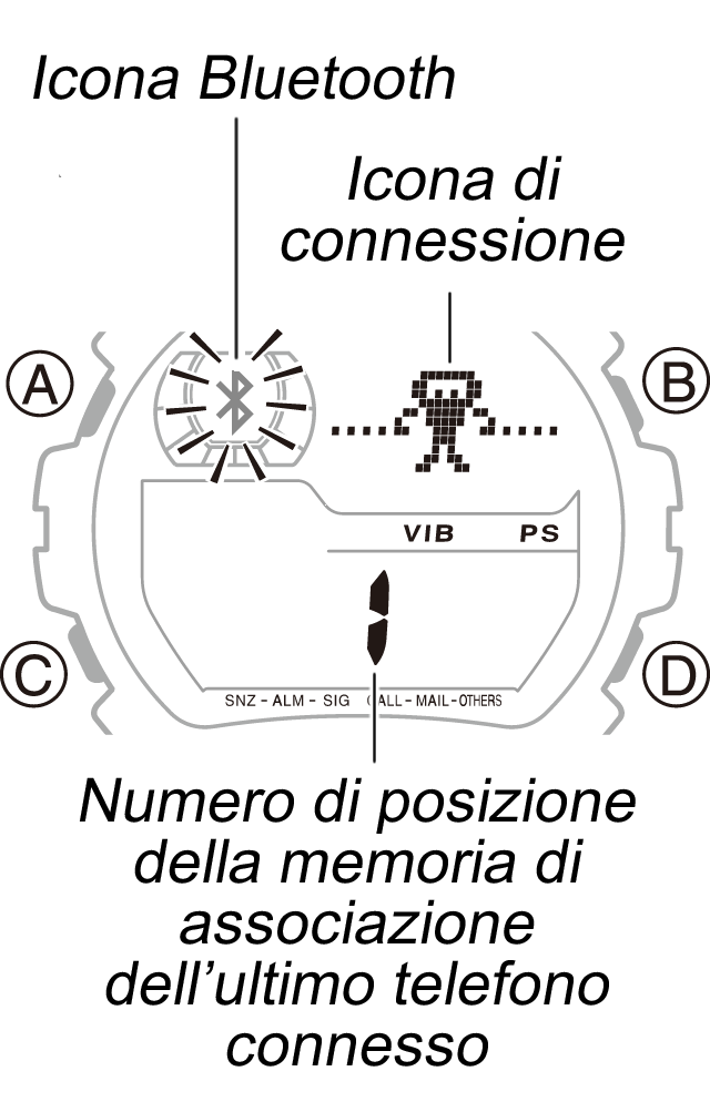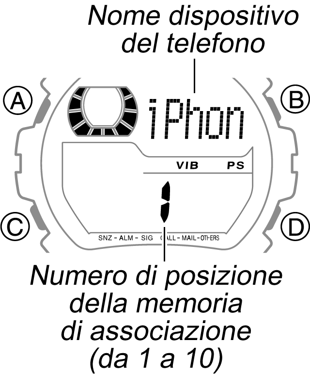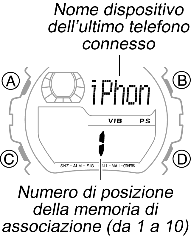 - Sull'orologio, utilizzare il pulsante D per scorrere le posizioni della memoria di associazione, fino a visualizzare quella del telefono a cui si desidera connettersi.