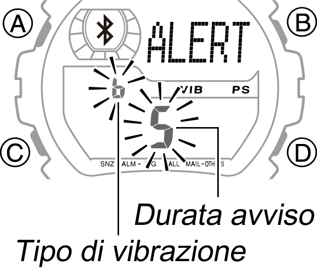 Ad ogni pressione del pulsante B, le impostazioni del tipo di vibrazione cambiano in base alla sequenza [A], [b], [C]. Dopo aver modificato queste impostazioni, l'orologio emette una vibrazione dimostrativa in base alle modifiche applicate.b. Attivazione/disattivazione della visualizzazione dell'animazione b.