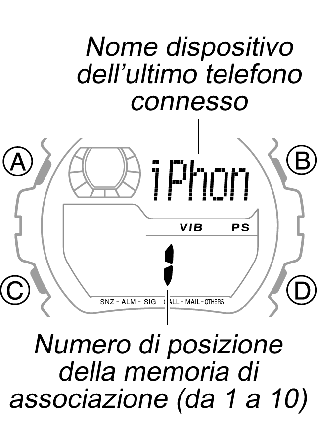 - L'orologio è in grado di memorizzare le informazioni di associazione per un massimo di 10 telefoni. Tuttavia, l'orologio può essere connesso a un solo telefono alla volta. L'associazione è un'operazione che prepara l'orologio e il telefono per la reciproca connessione. Non rappresenta l'effettiva connessione tra l'orologio e il telefono per la comunicazione dei dati.