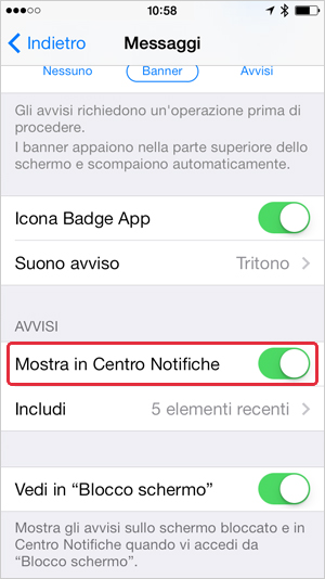 Impostazioni > Centro Notifiche > selezionare l'app > Mostra in Centro Notifiche