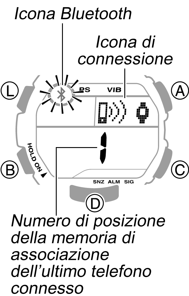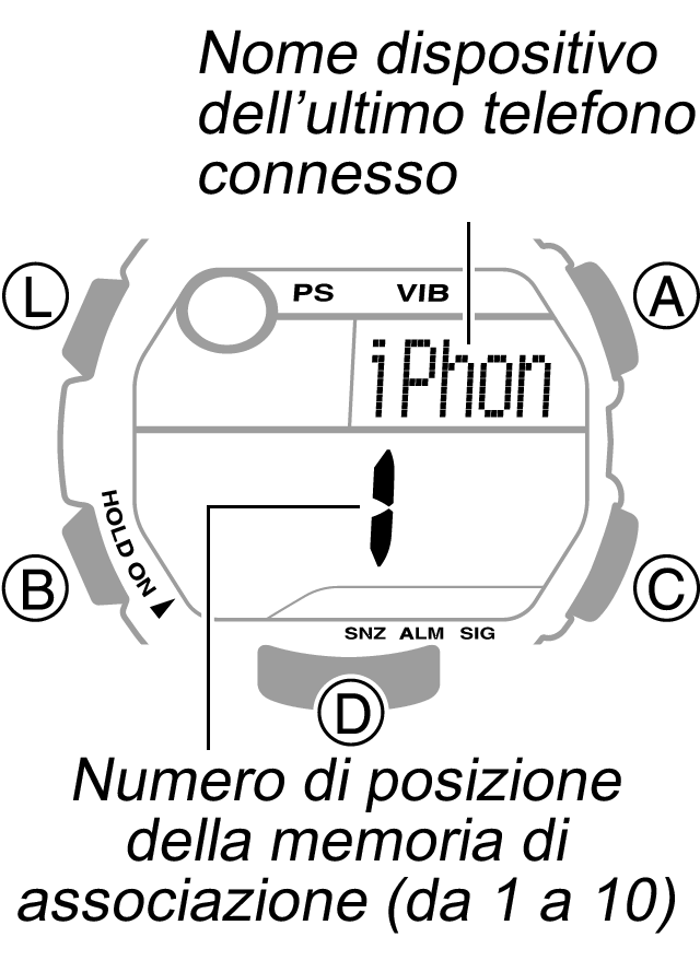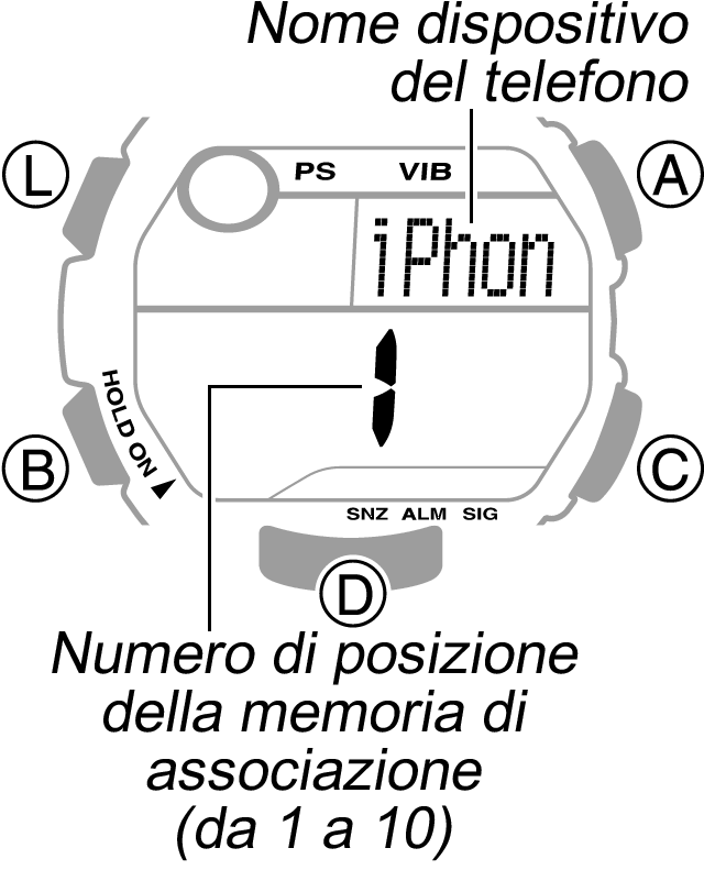 - Sull'orologio, utilizzare il pulsante B per scorrere le posizioni della memoria di associazione, fino a visualizzare quella del telefono a cui si desidera connettersi.