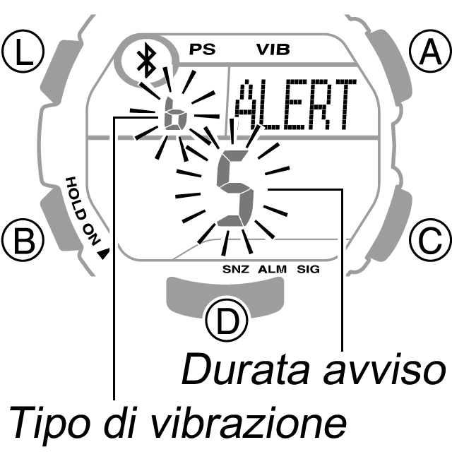 Premendo A è possibile scorrere le impostazioni del tipo di vibrazione nella sequenza [A], [b], [C]. Dopo aver modificato queste impostazioni, l'orologio emette una vibrazione dimostrativa in base alle modifiche applicate.b. Metodo di avviso per la notifica delle chiamate in entrata