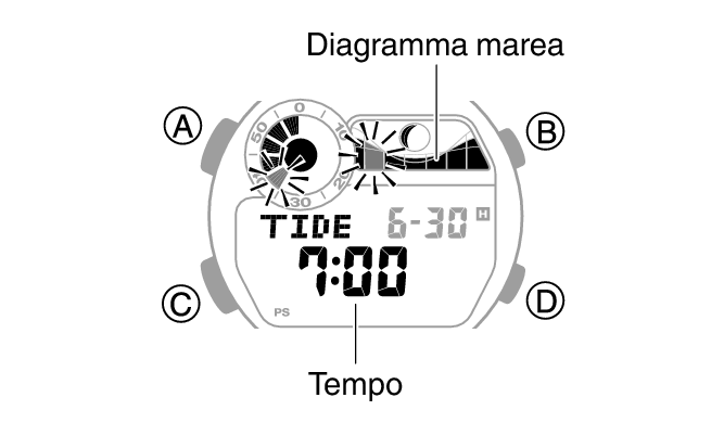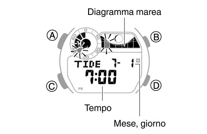 Utilizzare (D) per selezionare l’ora per la quale si desidera visualizzare il diagramma della marea.