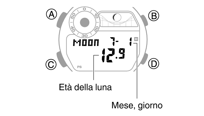 Premere (A) per alternare tra Ricerca della marea e Ricerca della luna.