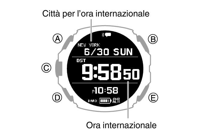 Eseguire le operazioni necessarie sull’orologio per selezionare una città per l’ora internazionale e per configurare le impostazioni dell’ora legale per la città dell’ora internazionale.