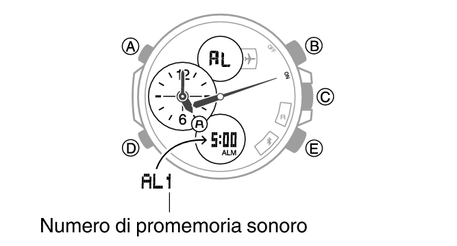 1.Premere (E) per scorrere i numeri dei promemoria sonori finché non viene visualizzato il numero del promemoria da configurare.