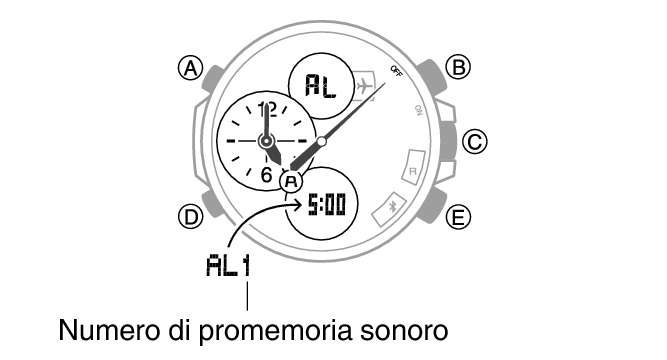 1.Premere (E) per scorrere i numeri dei promemoria sonori (da [AL1] a [AL5]) finché non viene visualizzato il numero del promemoria da configurare.