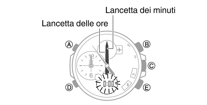 2.Se le lancette piccole delle ore e dei minuti non sono sulle ore 12, utilizzare (B) e (E) per spostarle in questa posizione.