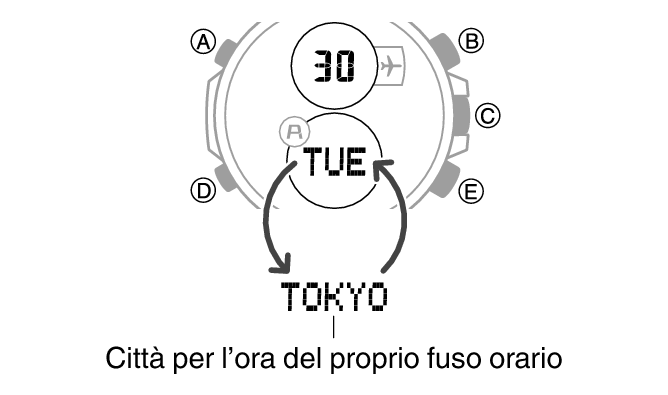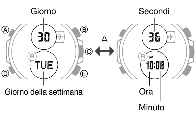 Nel modo di indicazione dell’ora è possibile utilizzare la seguente operazione per modificare i contenuti dei display digitali.