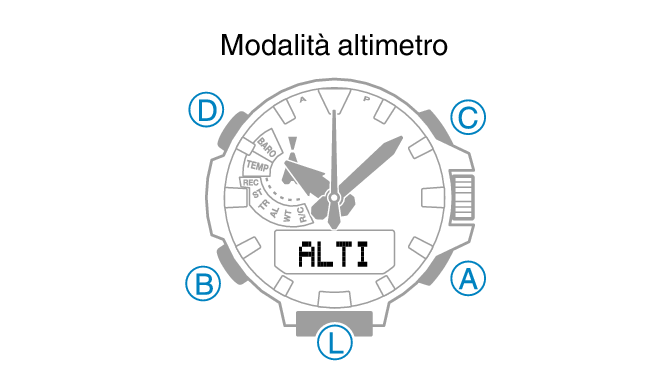 Quando si accede alla modalità altitudine, la lancetta dei secondi indicherà i secondi di indicazione dell’ora o il differenziale tra le misurazioni di altitudine (in base all’indicazione visualizzata l’ultima volta in cui è stato effettuato l’accesso alla modalità altitudine). È possibile passare l’indicazione della lancetta dei secondi dai secondi al differenziale tra i valori misurati e viceversa premendo (D).