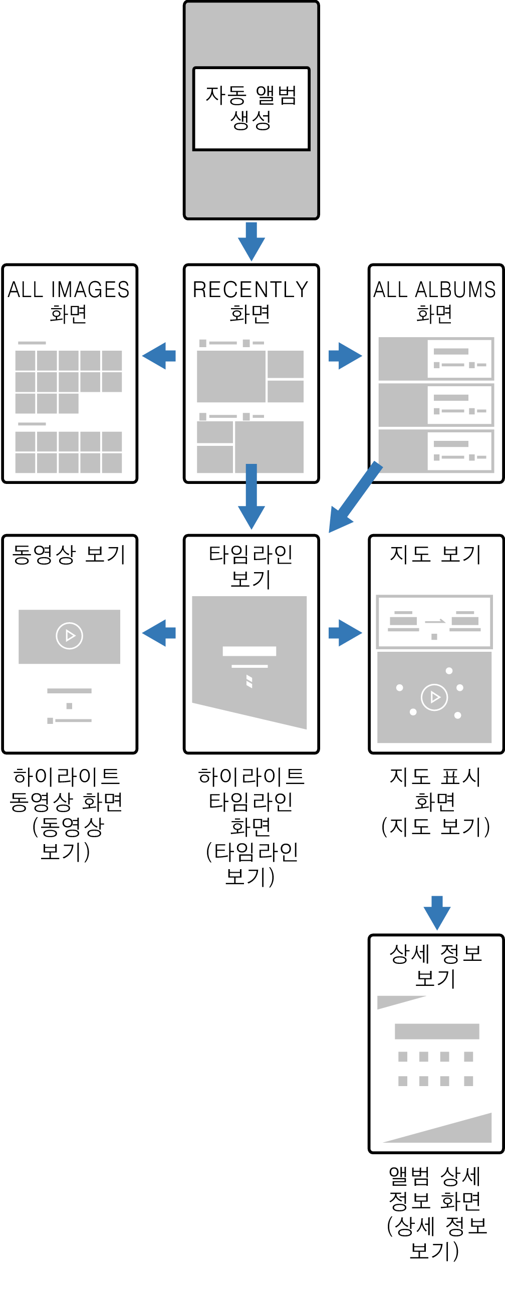 EXILIM ALBUM은 스마트폰에 저장된 스냅사진과 동영상의 앨범을 자동으로 생성합니다.