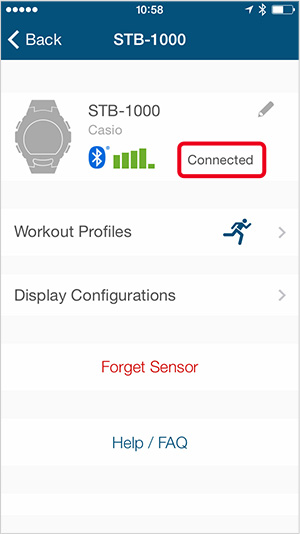 재연결이 완료되면 시계에서 진동이 발생하고 화면에 Bluetooth 아이콘 및 "Connected(연결 완료)" 메시지가 표시됩니다. 첫 화면으로 돌아가 다시 운동을 시작하십시오.