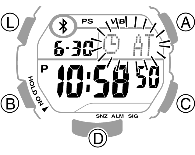 - 제어 표시기가 표시되면 시계가 제어 모드 상태가 됩니다. 이 경우 B 버튼을 약 3초간 누르고 있으면 제어 모드가 종료됩니다. 그런 다음 이 절차의 2단계를 수행합니다.