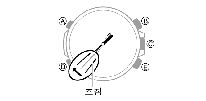 남은 충전량 및 전지 방전 충전 수준은 시계 바늘의 움직임으로 알 수 있습니다. 전지 전원이 줄어들면 기능을 사용할 수 없게 됩니다. 전지 전원 부족 시간 표시 모드에서는 초침이 2초 간격으로 움직입니다. 그 밖의 시계 기능은 정상적으로 작동합니다. 전원이 더 줄어들면 모든 바늘이 12시에 멈추고 [CHG]가 깜박거립니다. 전지 방전 모든 바늘이 12시에 멈추고 디지털 디스플레이에 아무 내용도 표시되지 않습니다.