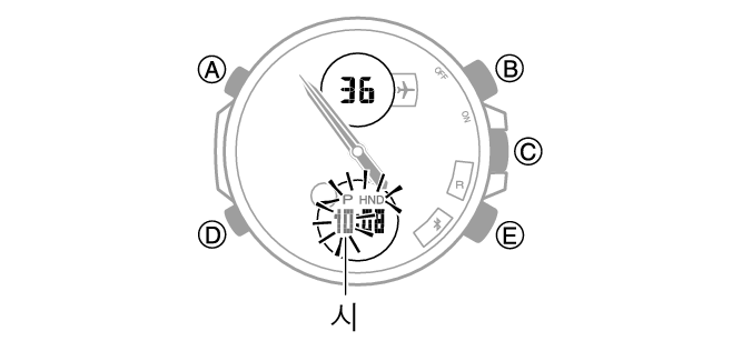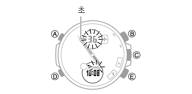 2.디스플레이에서 초 자리수가 깜박거릴 때까지 (D)를 6번 누릅니다.