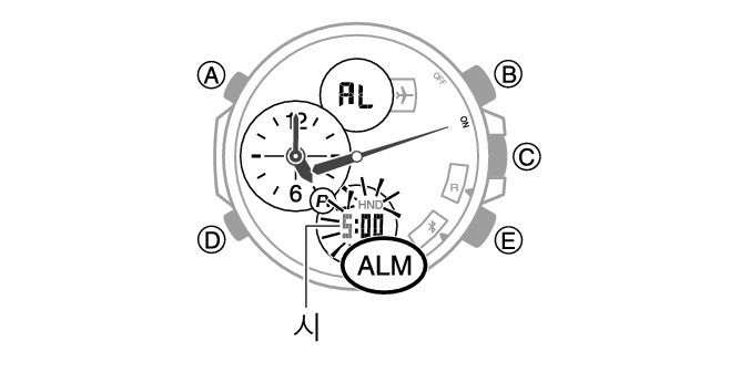 (B) 및 (E) 버튼: 현재 선택한 자리수(시간 또는 분)를 변경하는 데 사용됩니다.