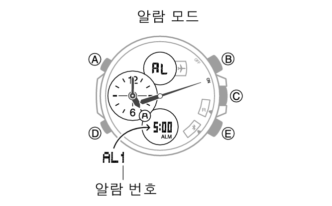 알람 모드에서 이 절차를 수행합니다. (D)를 사용하여 알람 모드를 탐색합니다.