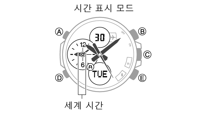 세계 시간 세계 시간을 이용하면 전 세계 40개의 도시 중 한 곳의 현재 시각을 확인할 수 있습니다. 준비 시간 표시 모드에서 이 절차를 수행합니다. (D)를 사용하여 시간 표시 모드를 탐색합니다. 모드 간 탐색