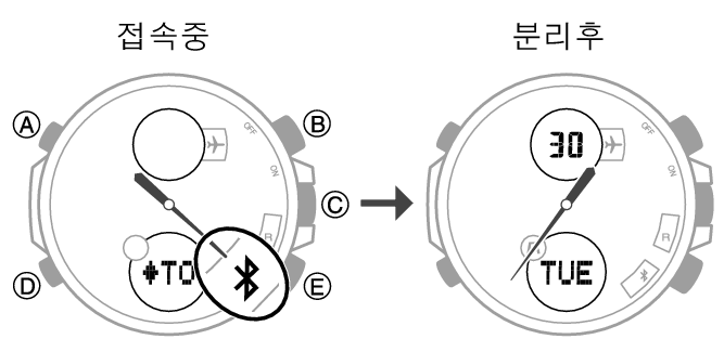 시계가 휴대폰과 연결된 경우 (C) 를 눌러 연결을 종료합니다. -