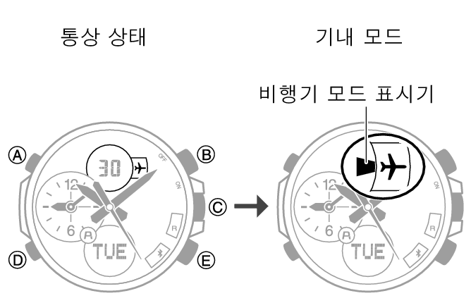 병원이나 비행기 등 무선 전파의 사용이 허용되지 않는 기타 모든 장소에 있을 때는 시계의 (D) 버튼을 약 5초간 눌러 기내 모드로 전환합니다.